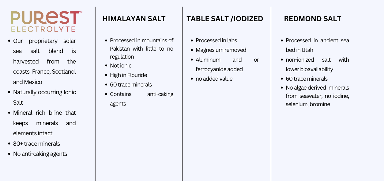What are the differences between Purest Electrolyte™ proprietary solar salt blend and Redmond salt, Himalayan salt and Table salt?